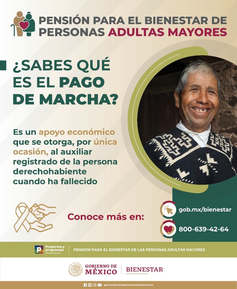 Se trata de un pago de 6 mil pesos bimestrales, que se entrega a través de la Tarjeta del Bienestar. Sin embargo en caso de que el beneficiario fallezca, los familiares están obligados a notificarlo y así acceder a un último depósito, llamado Pago de Marcha.