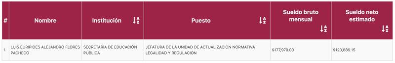 Su salario bruto actual corresponde a 177 mil 970 pesos mensuales y su sueldo neto estimado es de 123 mil 689 pesos, de acuerdo con información de la plataforma Nómina transparente, del gobierno federal.