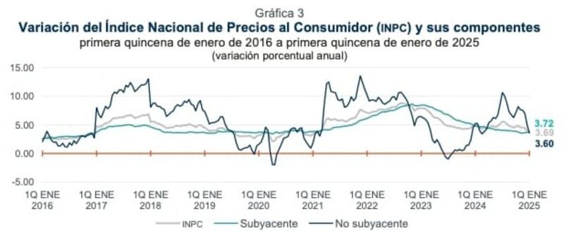Por otro lado, el Índice Nacional de Precios al Consumidor (INPC) presentó un aumento del 0.20% en la primera quincena de enero, también el más bajo para un mismo periodo desde el 2019, que llegó al 0.11%.