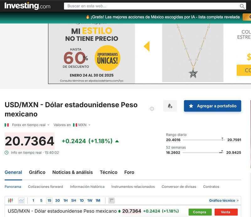 De acuerdo con datos de Bloomberg, el tipo de cambio se disparó de 20.46 a un máximo de 20.73 pesos por dólar, luego de la declaración de Donald Trump, en la que explicó que al final de este jueves 30 de enero aplicará un arancel del 25% a las importaciones de México y Canadá.