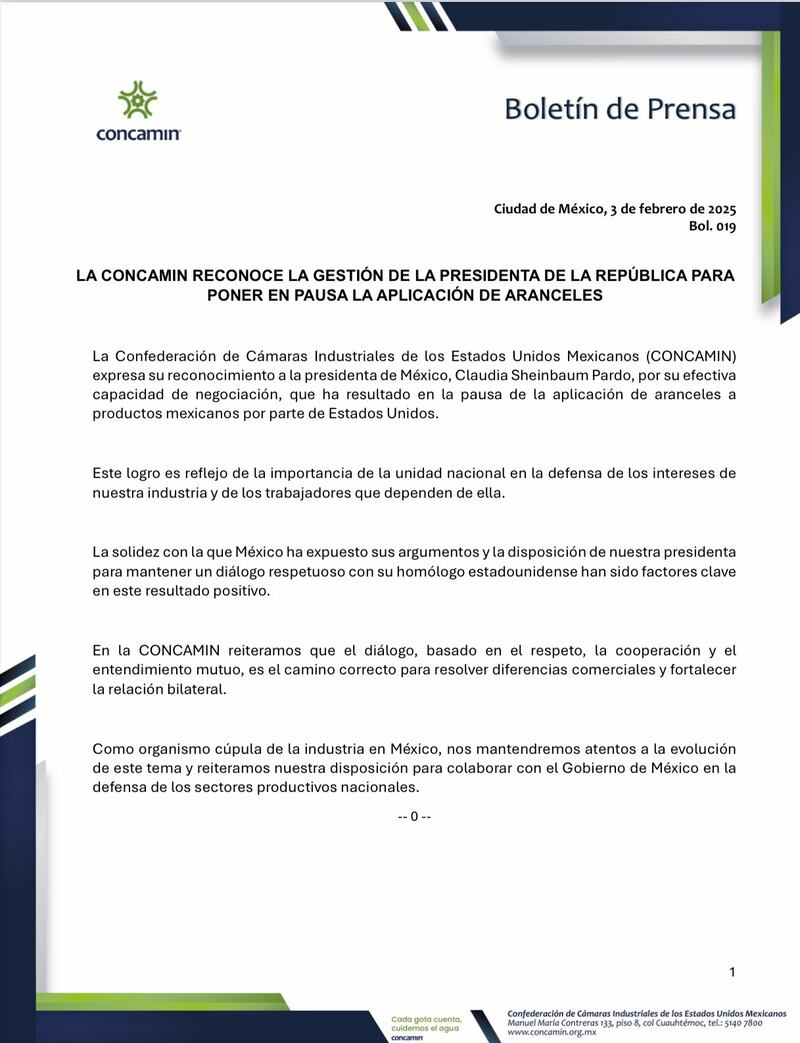 Asimismo, la CONCAMIN reiteró su compromiso con el gobierno mexicano para colaborar en la defensa de los sectores productivos nacionales.