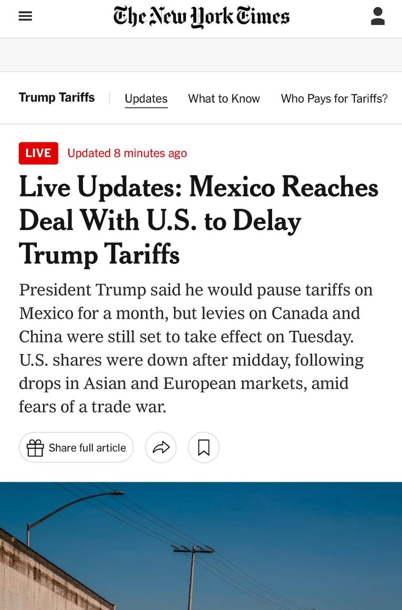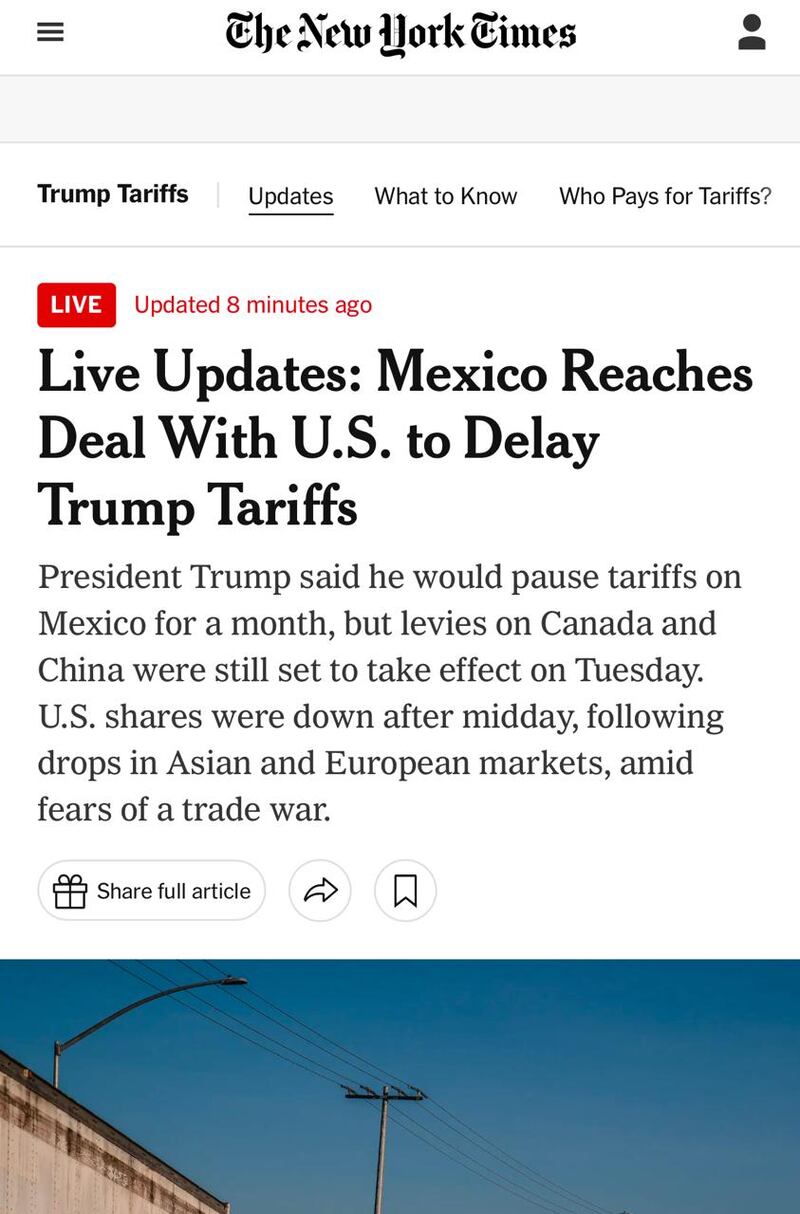 “Estados Unidos y México llegaron a un acuerdo el lunes para retrasar un mes un arancel del 25% sobre todas las importaciones mexicanas, después de que México acordó aumentar la seguridad en su frontera, evitando, al menos por ahora, una medida que podría haber elevado los precios para los consumidores estadounidenses y estancado las economías de ambos países”, señala.