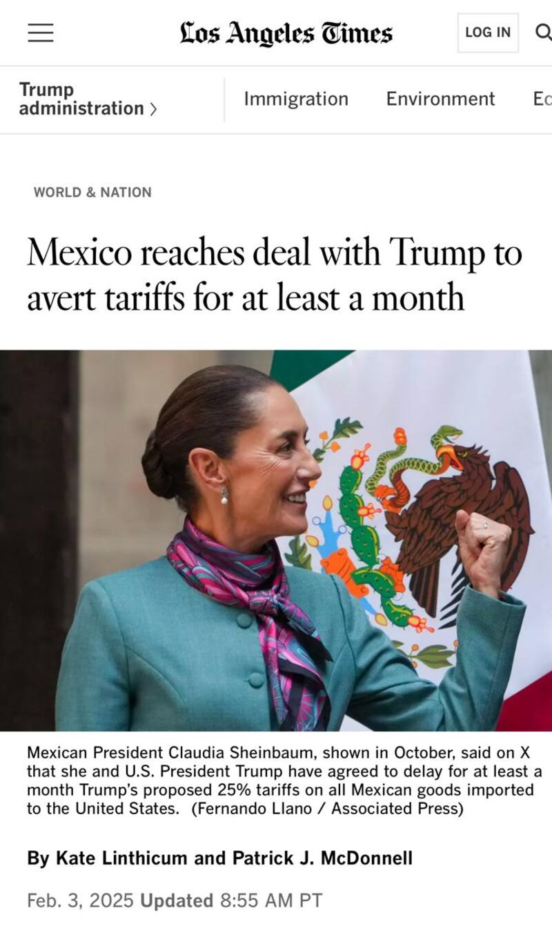 “México logró evitar los aranceles estadounidenses —por ahora— después de que su presidente llegó a un acuerdo de último minuto con el presidente Trump”, señala la publicación de ”Los Angeles Times”.