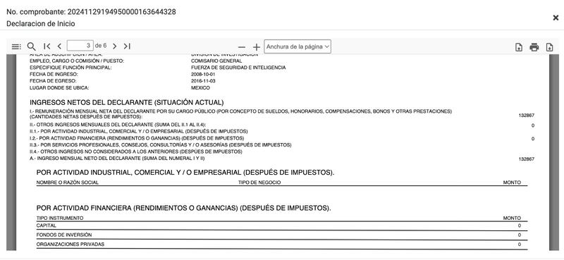 También percibía ingresos adicionales, como gratificación anual de 263 mil 994, una prima vacacional semestral de 5 mil 775.52 pesos, una previsión social múltiple de despensa y una prima de 10 mil 982 pesos mensuales brutos.
