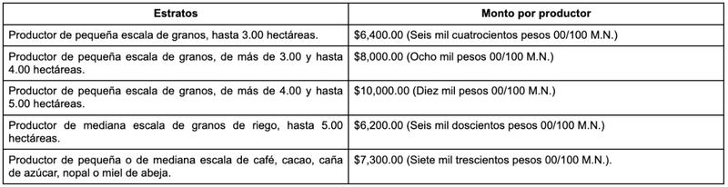 El programa apoya, preferentemente, a personas productoras de granos, caña de azúcar, café, cacao, nopal o miel de abeja. Pero se contemplan los cultivos de granos como maíz, frijol, trigo, arroz, avena, cebada, milpa, soya, ajonjolí, cacahuate, garbanzo, haba, cártamo, calabaza chihua (pipián), lenteja, girasol, arvejón, linaza, colza o canola, sorgo, amaranto y chía.