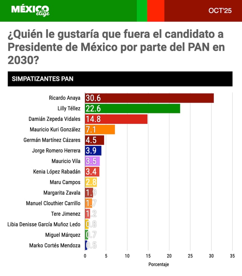 De acuerdo con el ejercicio estadístico realizado en octubre de 2025, la pregunta sobre “¿Quién le gustaría que fuera el candidato a presidente de México por parte del PAN en 2030?” arrojó las siguientes cifras: