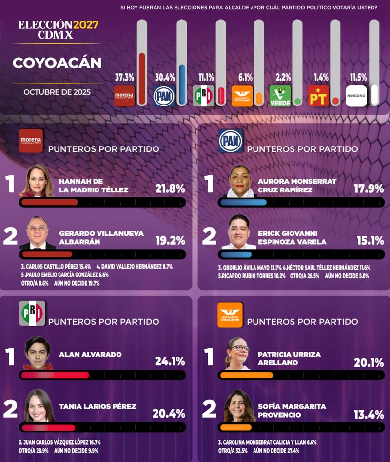 Pero según los datos de la encuesta realizada por Gobernarte, esto podría cambiar, pues una de las demarcaciones que perderían es Coyoacán donde Morena es quien llevaría la ventaja al registrar un 37.3% de la intención de voto de su lado. En contraste, el PAN se encuentra en la segunda posición con un 30.4%.
